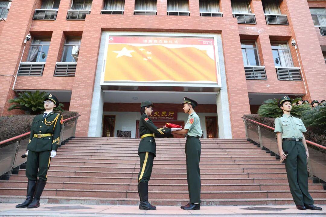 今年的交接仪式,恰逢纪念中国人民抗日战争暨世界反法西斯战争胜利80周年。2024级国旗护卫队两位班长康容与和郭晨以中英文共同发表了题为《硝烟记忆照前路,步履铿锵护荣光》的国旗下讲话。他们深情回望民族苦难,回顾护旗征程,满怀感恩地向新一届队员们发出庄重的嘱托:“今天,我们将国旗交付于你们,请你们牢记使命,护卫国旗。” 新一届国旗班队员回应:“请你们放心,请老师和同学们放心,我们一定不辱使命!”