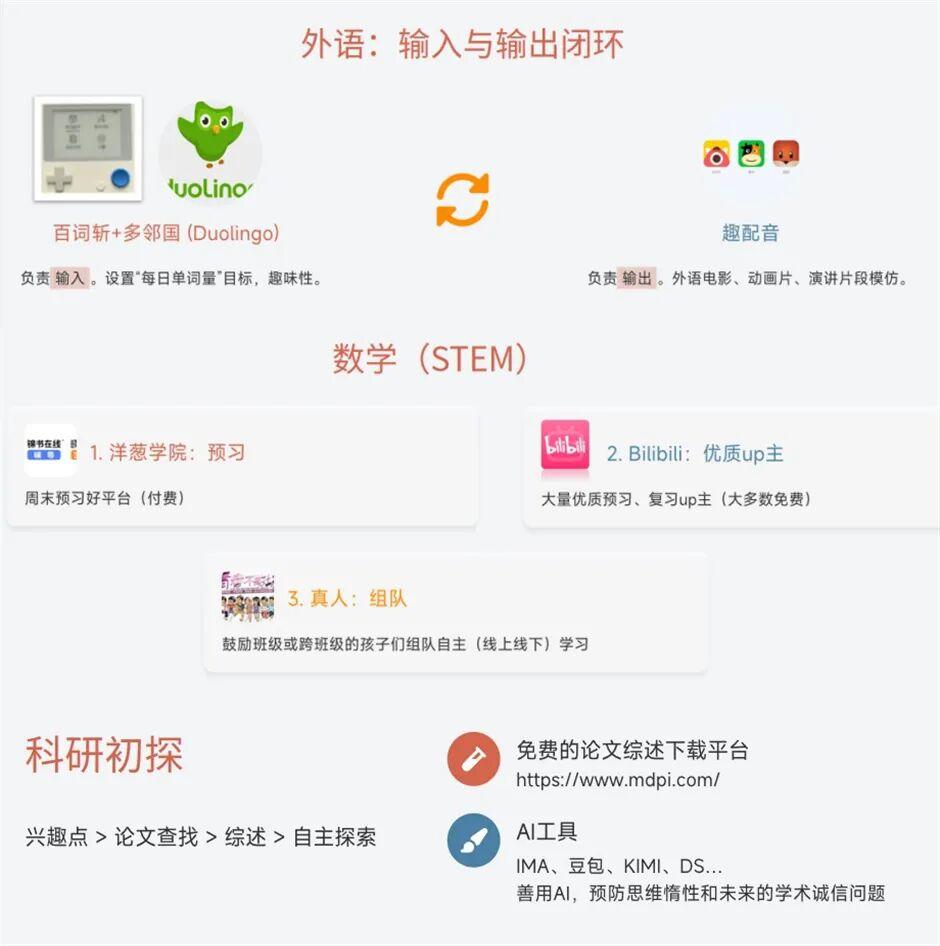 分享最后,龙爸整理了全方位的资源与工具清单:外语学习可借助原版书籍、多语种影视与在线APP,数学提升可结合生活场景与错题管理方法,科研探索推荐MDPI等论文平台与合规AI工具;同时,还提供了家校沟通计划表、项目式学习设计模板等实用资料,方便家长直接落地使用。