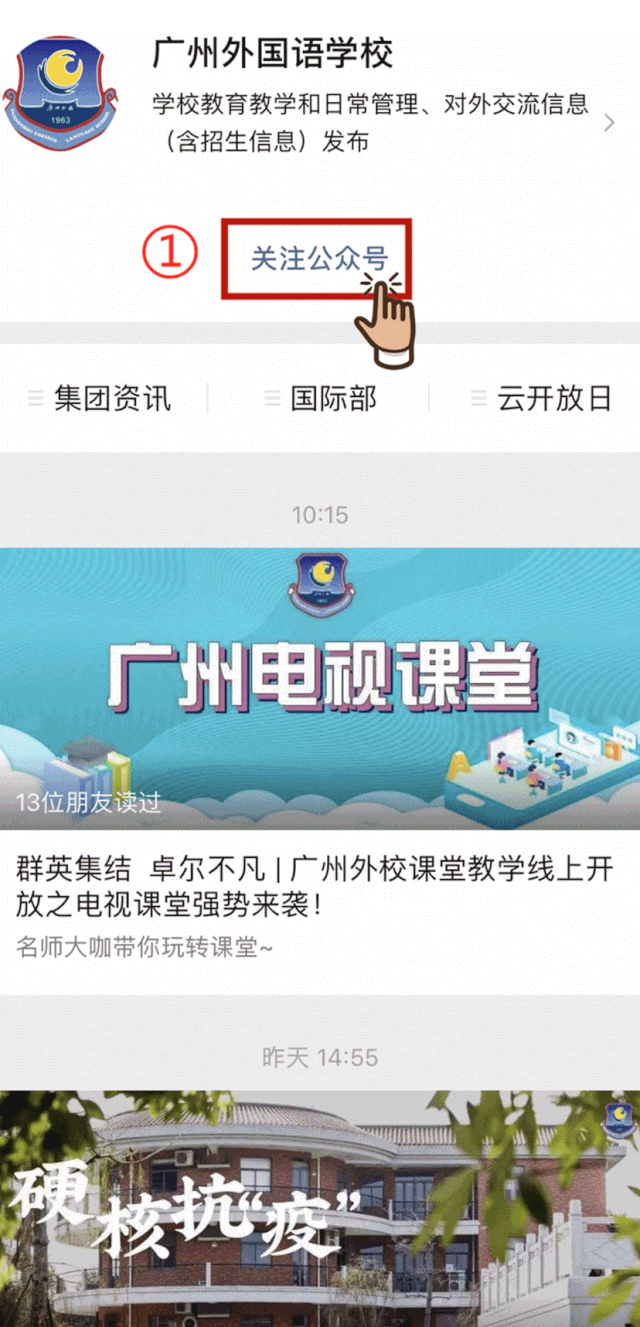 (2)关注“广州外国语学校”微信公众号,活动当天进入主页面,点击菜单栏【云开放日】观看直播。